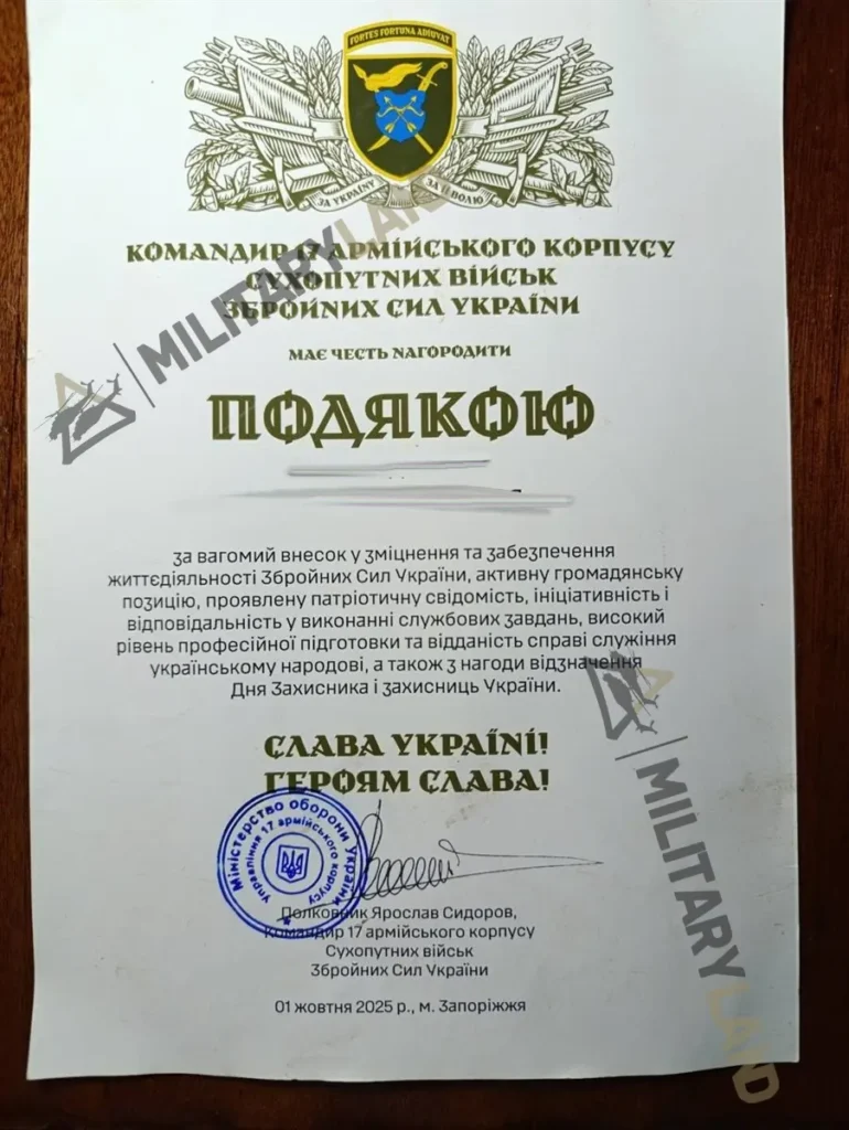 The former commander of the 14th Mechanized Brigade, Colonel Yaroslav Sidorov, has been appointed commander of Ukraine’s 17th Army Corps. His appointment was revealed through a gift certificate issued by the corps, obtained and verified by MilitaryLand.