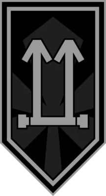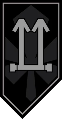 The insignia continues the trend of the brigade with the pointed chevron style. The central imagery is significantly less significant as opposed of other battalions, using minimalistic shapes. It contains two arrows on a rod to signify the battalion’s designation and its role as an assault unit to move forward. Behind the arrows is a five-leaf clover, symbolizing exceptional luck.