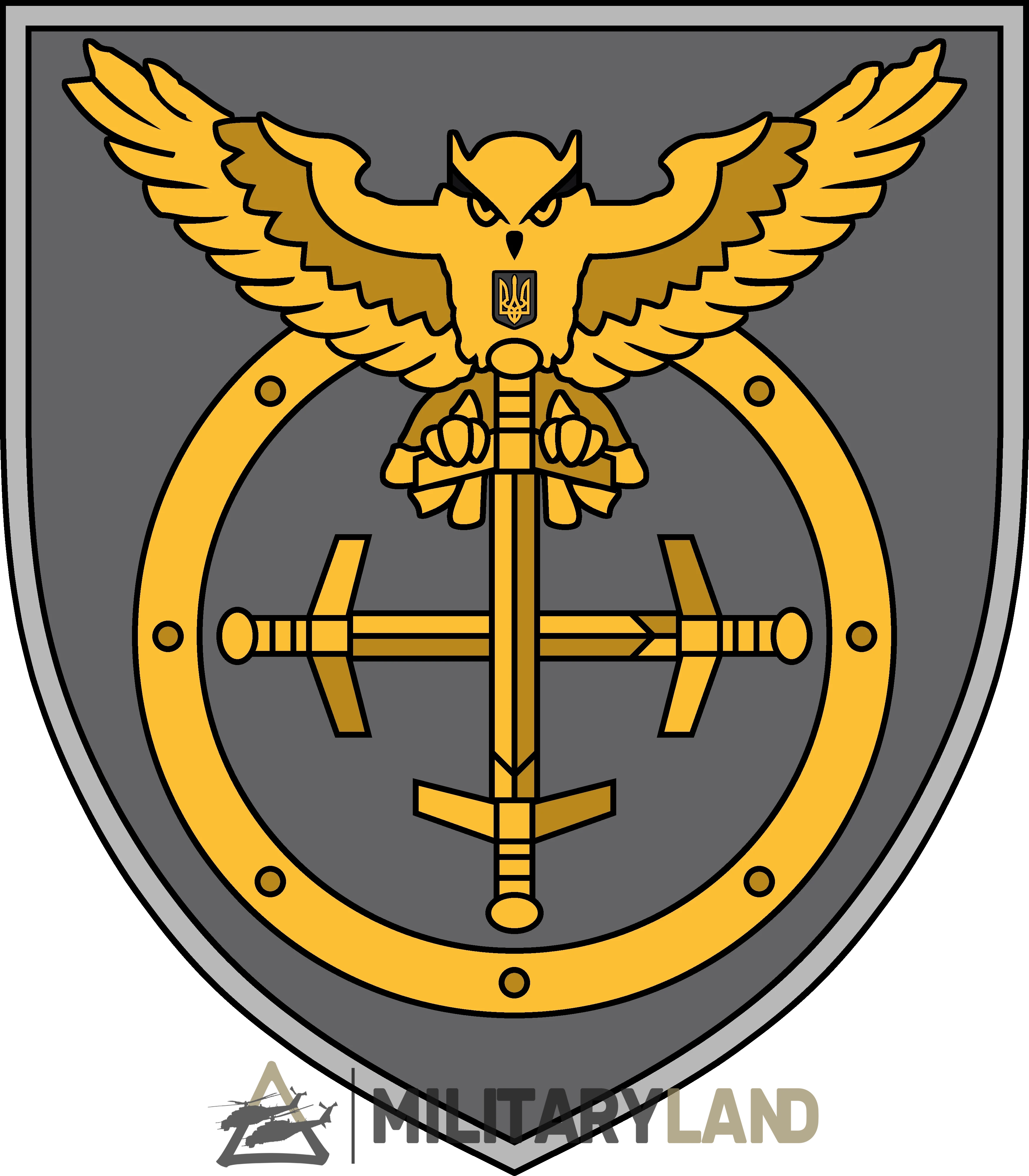 The insignia features a chevron displayed with a silver grey border and dark grey canvas. The center of the insignia depicts an owl, which is commonly associated with the Main Intelligence Directorate despite the unit being in the Ground Forces, bearing four crossed swords in a circular ring with stamped rivets.