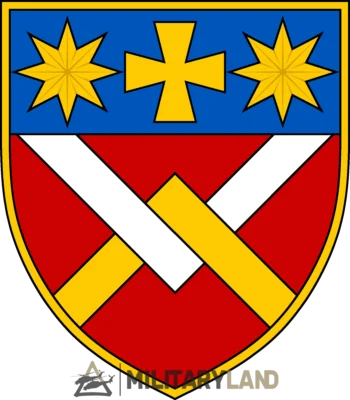 The insignia features a chevron with a yellow border. At its center is a red field, while the upper third of the chevron is separated and colored blue. Within the blue section are two stars flanking a Cossack cross at the center. On the red field below sits a stylized knot, half white, half yellow, reflecting the brigade and the battalion’s own unique symbology.
