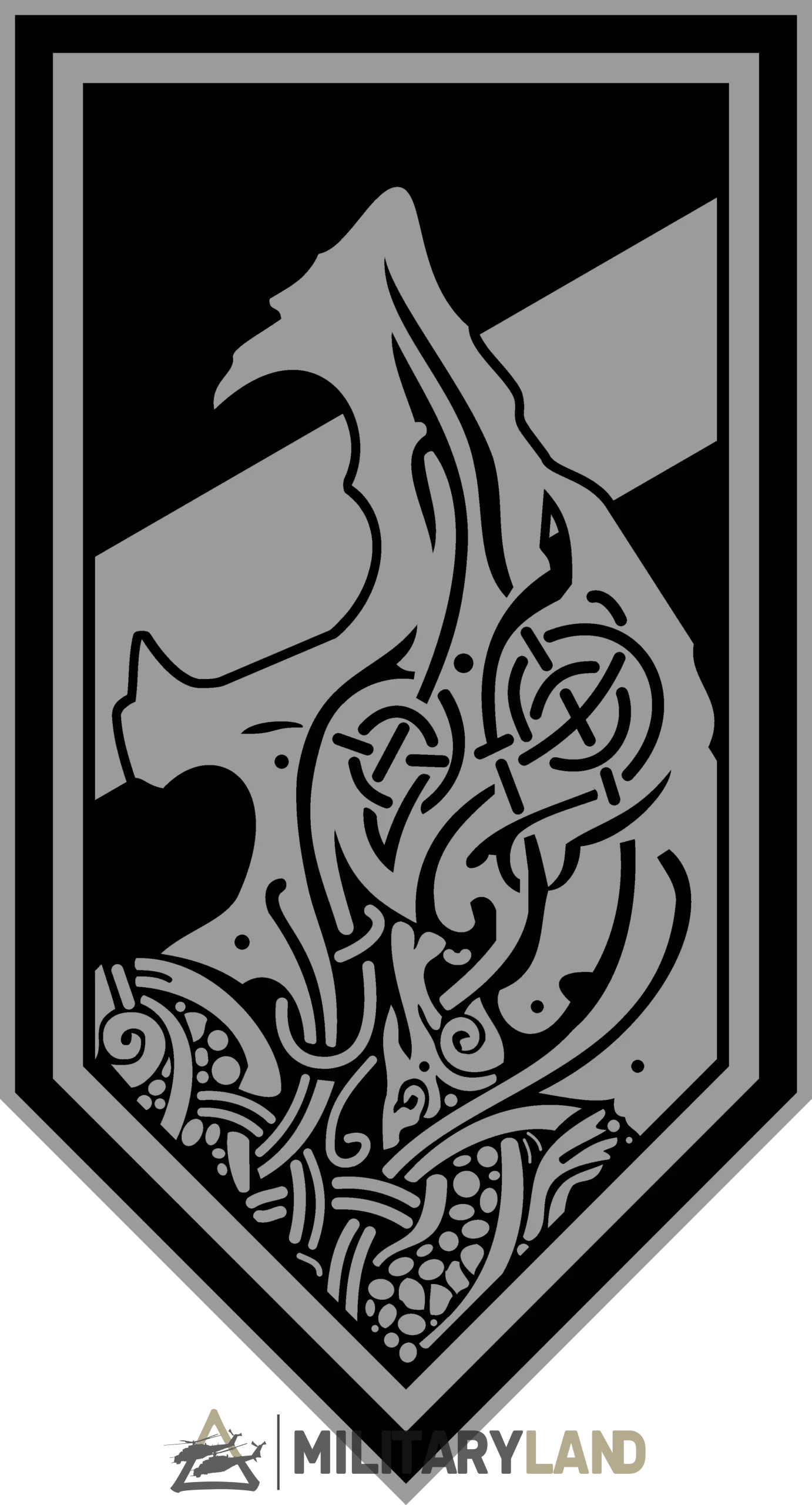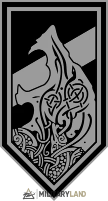 The insignia retains the traditions of the brigade’s pointed chevron appearance. It depicts subdued tones of black and grey, with the center of the insignia having a diagonal line, representing Western imagery designating a reconnaissance unit. Above it is a stylized Fenrir animal, commonly associated with Scandinavian and Norse mythology.