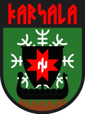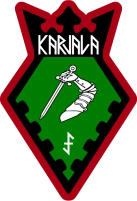 The insignia features a stylized diamond with a crown at its peak. The border of the insignia was red, followed by black, and a green centre, depicting the colors of the Karelian flag. The top of the insignia features an inscription of “Karjala”, and the central imagery contains an arm with armored plating and a sabre – a reference to the Academic Karelia Society. Below this is a Wolfsangel symbol.