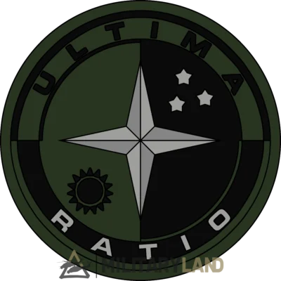 The insignia of the detachment strays away from the traditional pointed chevron insignia of the brigade. It is instead a roundel featured in a subdued color palette of green and black. The central imagery features a four-pointed star in grey with a black sun in the bottom left half and three five-pointed stars in the top right. Surrounding these symbols is the detachment’s motto: “Ultima Ratio”, meaning “Last Resort” in English.